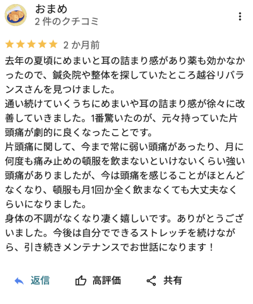 去年の夏頃にめまいと耳の詰まり感があり薬も効かなかったので、鍼灸院や整体を探していたところ越谷リバランスさんを見つけました。